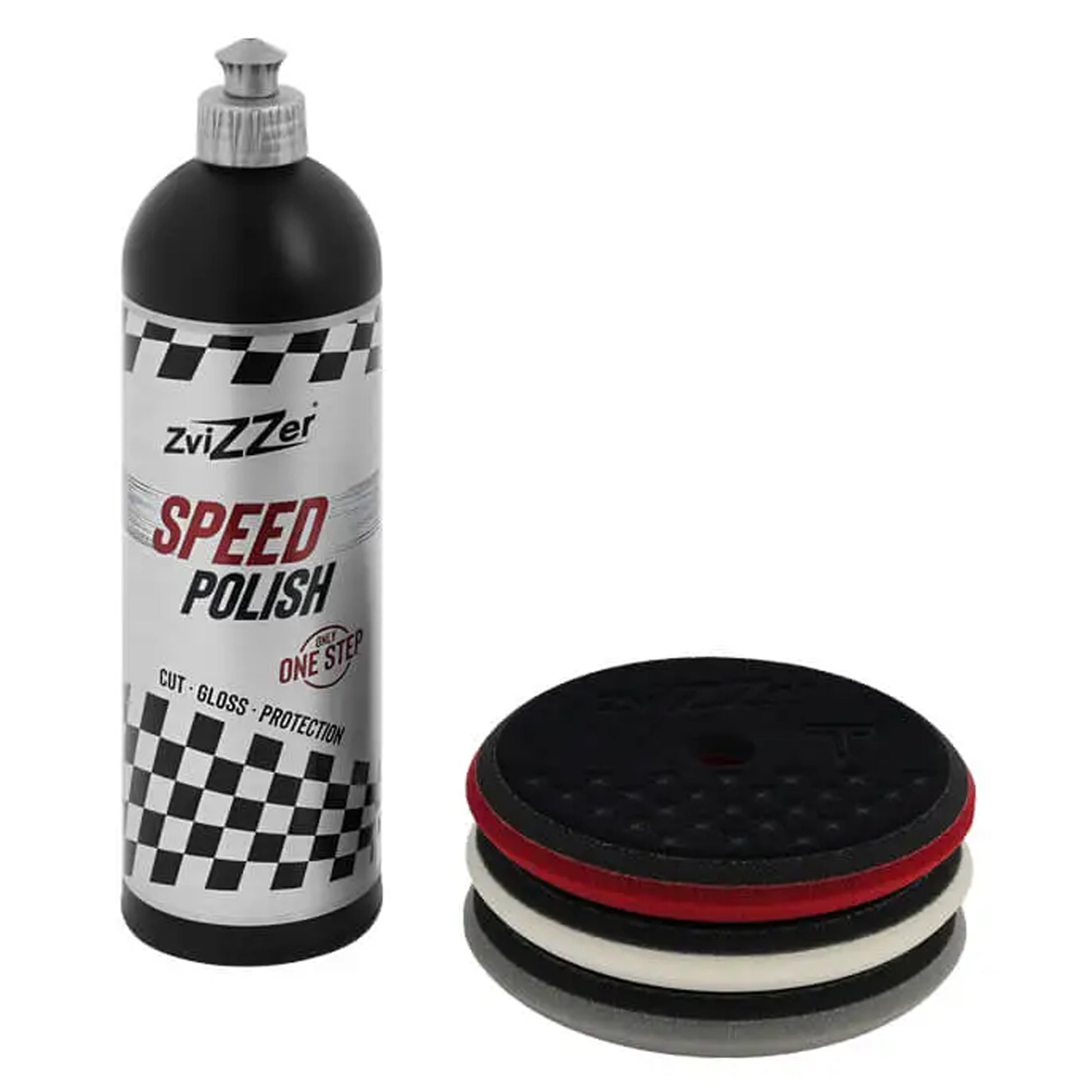 The set includes: ZviZZer Speed Polish 750ml and three 145mm UFO polishing pads in three different hardness's (Grey – hard, White – medium, Bordeaux – soft). Cut, finish, and protect surfaces in one step.